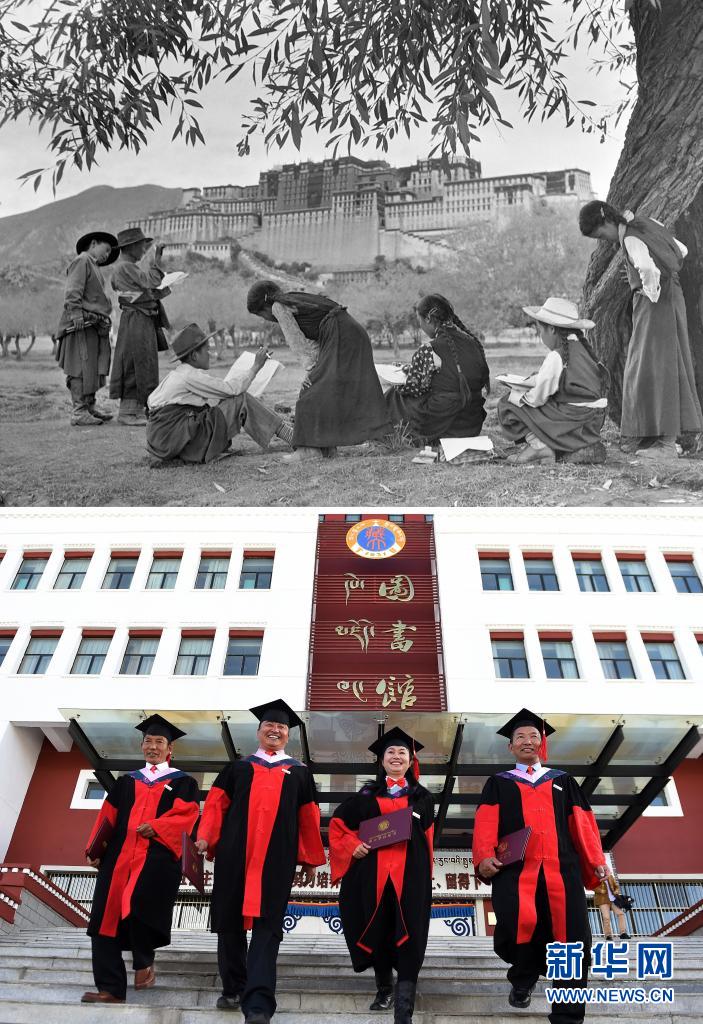 拼版照片:上圖是20世紀(jì)50年代,拉薩小學(xué)的學(xué)生在布達(dá)拉宮前練習(xí)寫生(新華社記者任用昭攝);下圖是2017年11月10日,西藏本土培養(yǎng)的首批博士研究生畢業(yè)(新華社記者覺果攝)。新華社發(fā)
