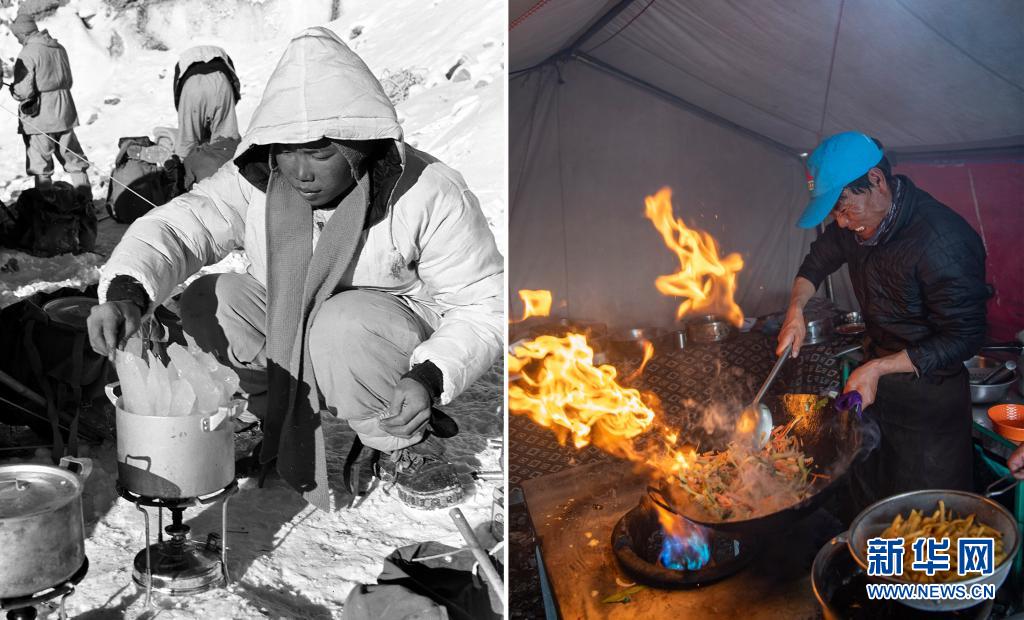 拼版照片:左圖是20世紀(jì)60年代,我國登山隊(duì)員在海拔5700米冰川上宿營時(shí)融冰煮飯(新華社記者陳宗烈攝);右圖是2020年5月10日,廚師在海拔6500米的前進(jìn)營地炒菜(新華社記者孫非攝)。新華社發(fā)