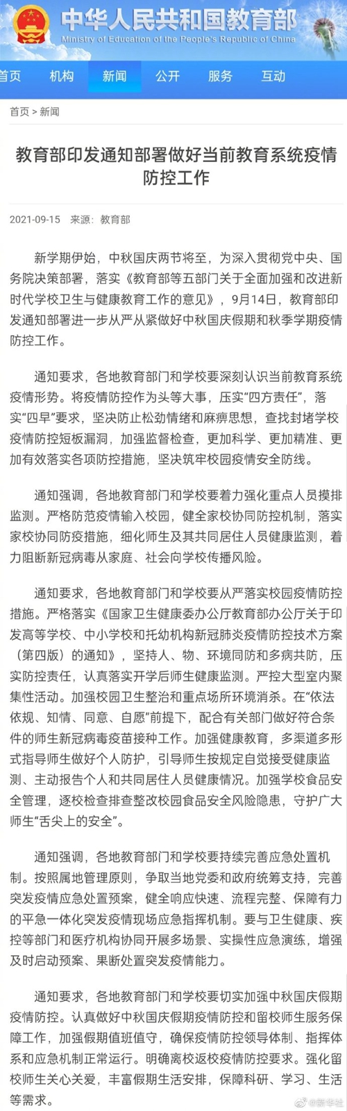 記者15日從教育部獲悉,教育部日前印發(fā)通知部署進(jìn)一步從嚴(yán)從緊做好中秋國慶假期和秋季學(xué)期疫情防控工作。通知要求,各地教育部門和學(xué)校要將疫情防控作為頭等大事,查找封堵學(xué)校疫情防控短板漏洞,健全家校協(xié)同防控機(jī)制,細(xì)化師生及其共同居住人員健康監(jiān)測,著力阻斷新冠病毒從家庭、社會(huì)向?qū)W校傳播風(fēng)險(xiǎn)。通知要求,各地教育部門和學(xué)校要做好中秋國慶假期疫情防控和留校師生服務(wù)保障工作,加強(qiáng)假期值班值守,確保疫情防控領(lǐng)導(dǎo)體制、指揮體系和應(yīng)急機(jī)制正常運(yùn)行。(記者余俊杰)