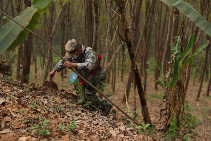 日前,記者跟隨段二文等人,走了一段他認(rèn)為很普通的巡邊路。當(dāng)天,熟悉路況的段二文走在最前面,遇到不好通過(guò)的地方,他拿著砍刀幾下就清除了障礙。隨后穿越一片橡膠林,經(jīng)過(guò)一條用來(lái)區(qū)分國(guó)境線的石板路,抵達(dá)最終的目的地——S144-2號(hào)界樁。