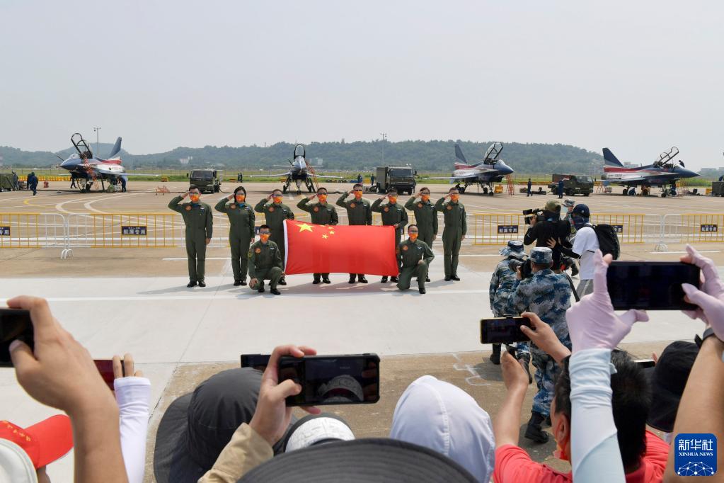10月1日,在第十三屆中國國際航空航天博覽會(huì)上,中國空軍八一飛行表演隊(duì)飛行員舉國旗向觀眾致意。新華社記者 琚振華 攝
