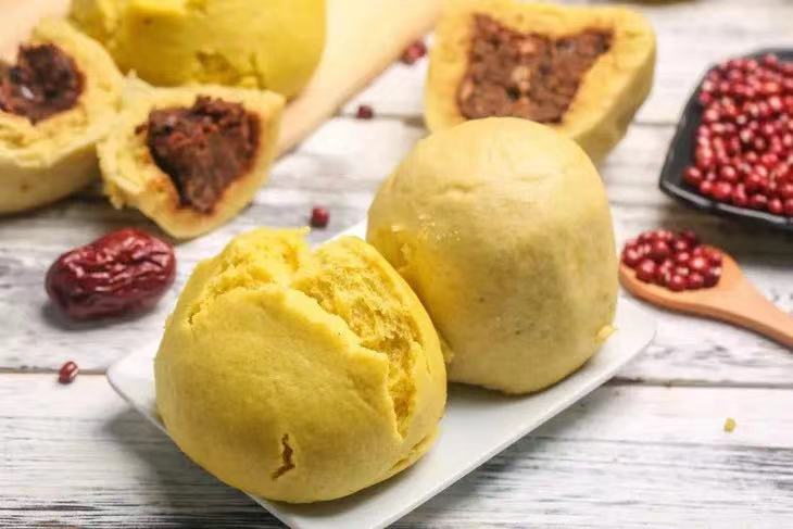 6.蒸制:水開(kāi)后放上包好的黃饃饃,大火蒸約20分鐘即可。關(guān)火后不要馬上打開(kāi)蓋子,悶蒸3分鐘后再打開(kāi)。取出的黃饃饃晾涼后即可食用。