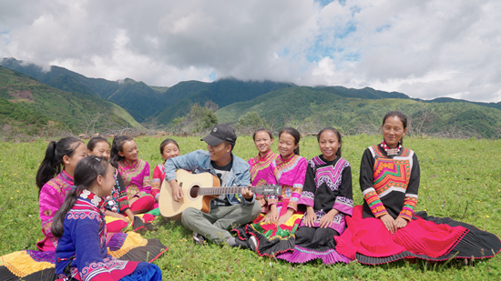 路面因為剛剛下過的雨水變得有些泥濘,走了約半小時的山路后,鄉(xiāng)村教師吉布小龍帶著合唱團(tuán)的“妞妞們”坐在山頂草坪上。他用吉他伴奏,9個女孩圍著他放聲歌唱:“不懼密林深處的豺狼,敢于深海淺灘與蛇蝎作伴……”不遠(yuǎn)處的青山峰巒起伏,山頂上云霧徜徉。