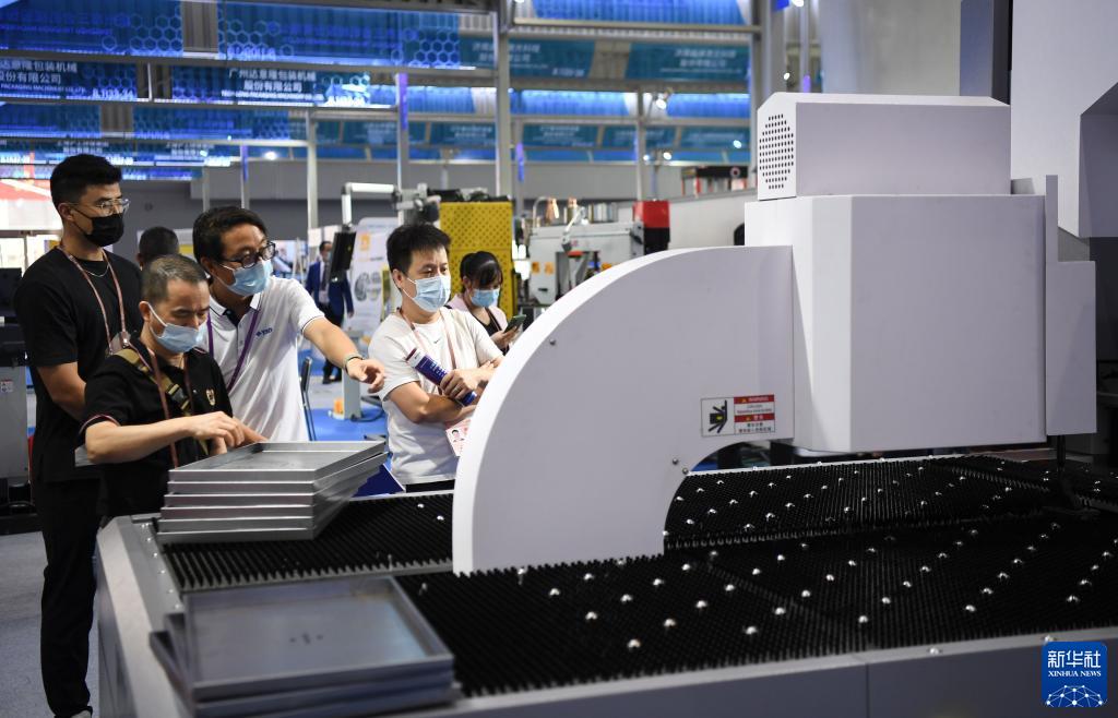 10月15日,在第130屆廣交會(huì)上,機(jī)械設(shè)備參展商(左三)向觀眾介紹產(chǎn)品性能。新華社記者 鄧華 攝