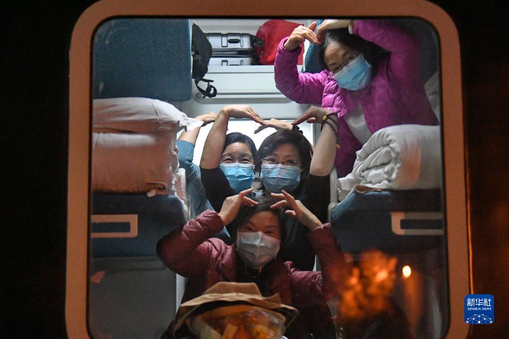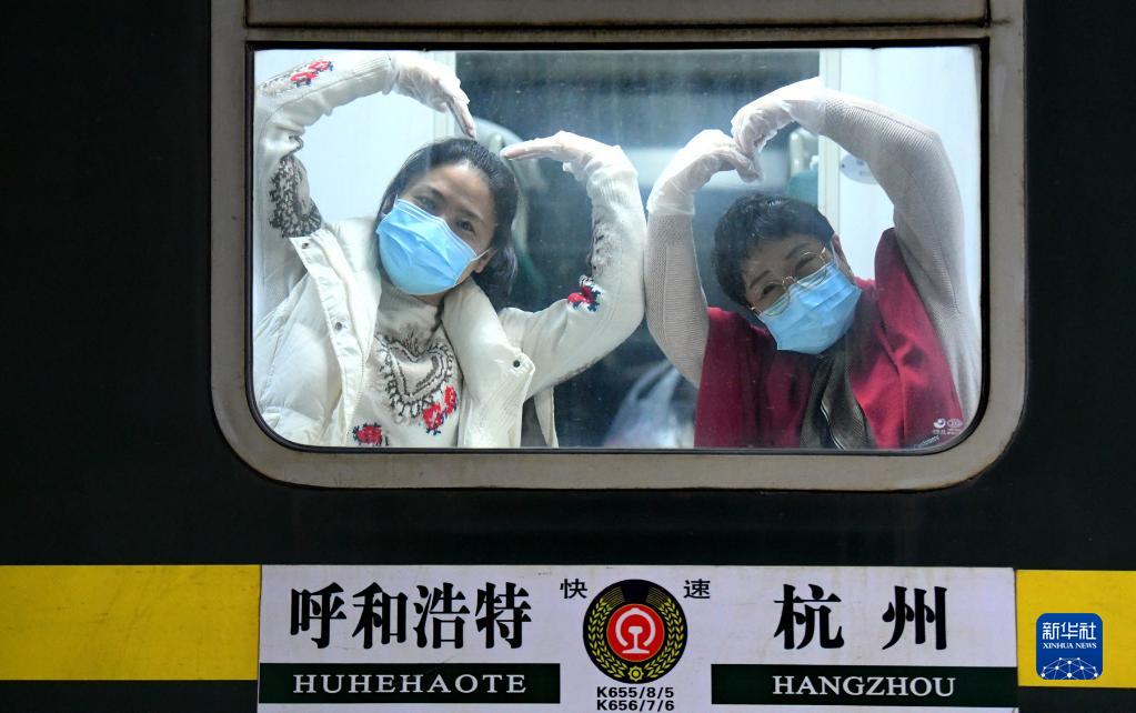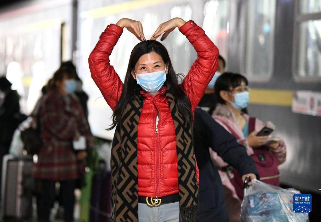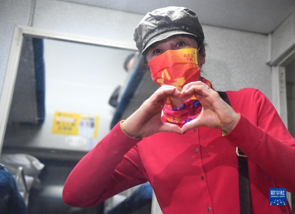 10月29日,一名滯留游客離開(kāi)額濟(jì)納旗時(shí),在列車車廂里用雙手比劃出“愛(ài)心”。新華社發(fā)(王磊 攝)