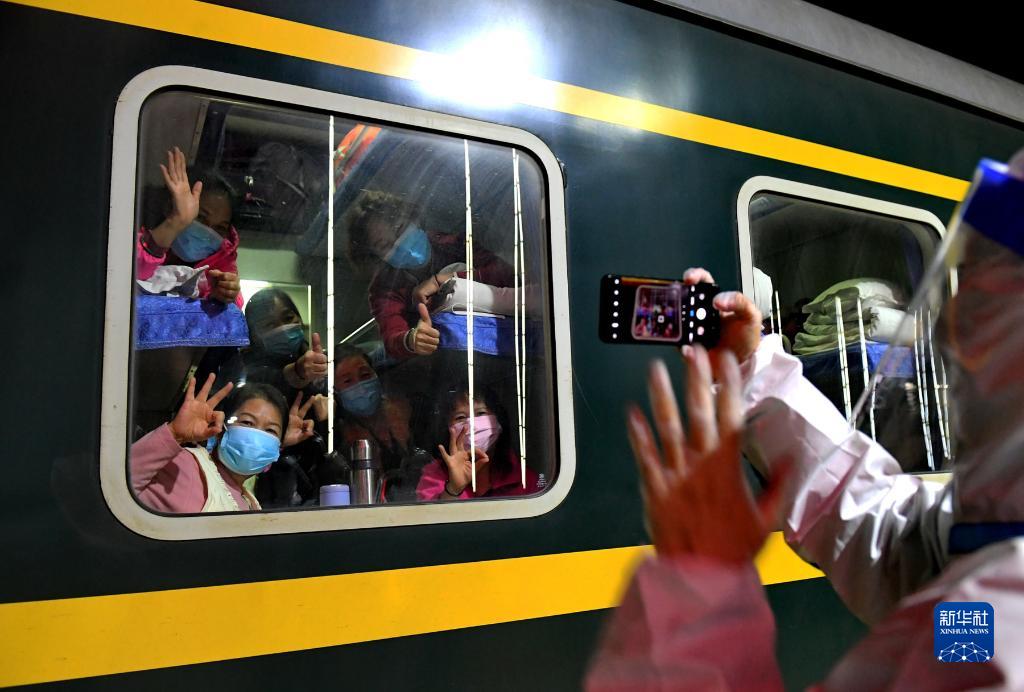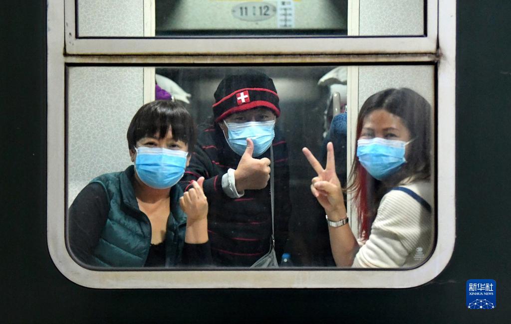 10月29日,滯留游客離開(kāi)額濟(jì)納旗時(shí),在列車車廂里與地面人員告別。新華社發(fā)(王磊 攝)