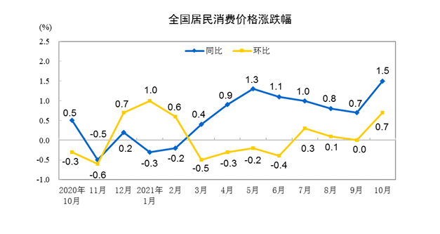 國家統(tǒng)計局10日發(fā)布數(shù)據(jù),10月份,全國居民消費價格指數(shù)(CPI)同比上漲1.5%,漲幅雖比上月擴大0.8個百分點,但仍低于宏觀調(diào)控預(yù)期目標(biāo),消費市場供需基本平穩(wěn)。