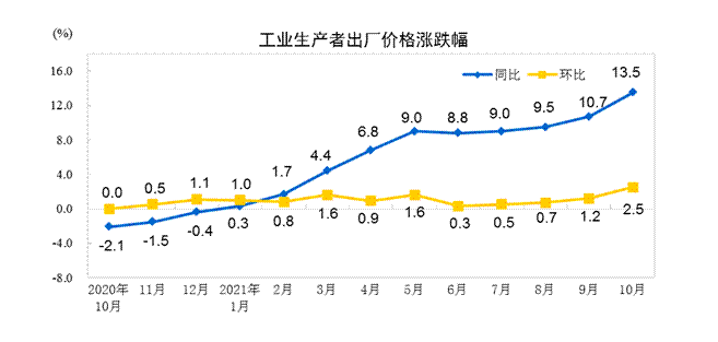專家分析,部分食品和工業(yè)消費品價格漲幅擴大,顯示大宗商品價格上漲壓力正向部分終端消費品傳導(dǎo)。據(jù)統(tǒng)計,受國際輸入性因素疊加國內(nèi)主要能源和原材料供應(yīng)偏緊影響,10月份,全國工業(yè)生產(chǎn)者出廠價格指數(shù)(PPI)同比上漲13.5%,漲幅比上月擴大2.8個百分點。