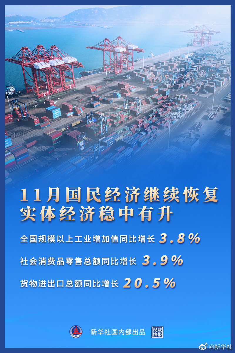 國家統(tǒng)計局15日發(fā)布的數(shù)據(jù)顯示,11月份,全國規(guī)模以上工業(yè)增加值同比增長3.8%,兩年平均增長5.4%;社會消費品零售總額41043億元,同比增長3.9%,兩年平均增長4.4%;貨物進(jìn)出口總額37164億元,同比增長20.5%。國民經(jīng)濟(jì)繼續(xù)保持恢復(fù)態(tài)勢,發(fā)展韌性不斷增強(qiáng)。(記者魏玉坤、鄒多為,海報設(shè)計楊軼群)