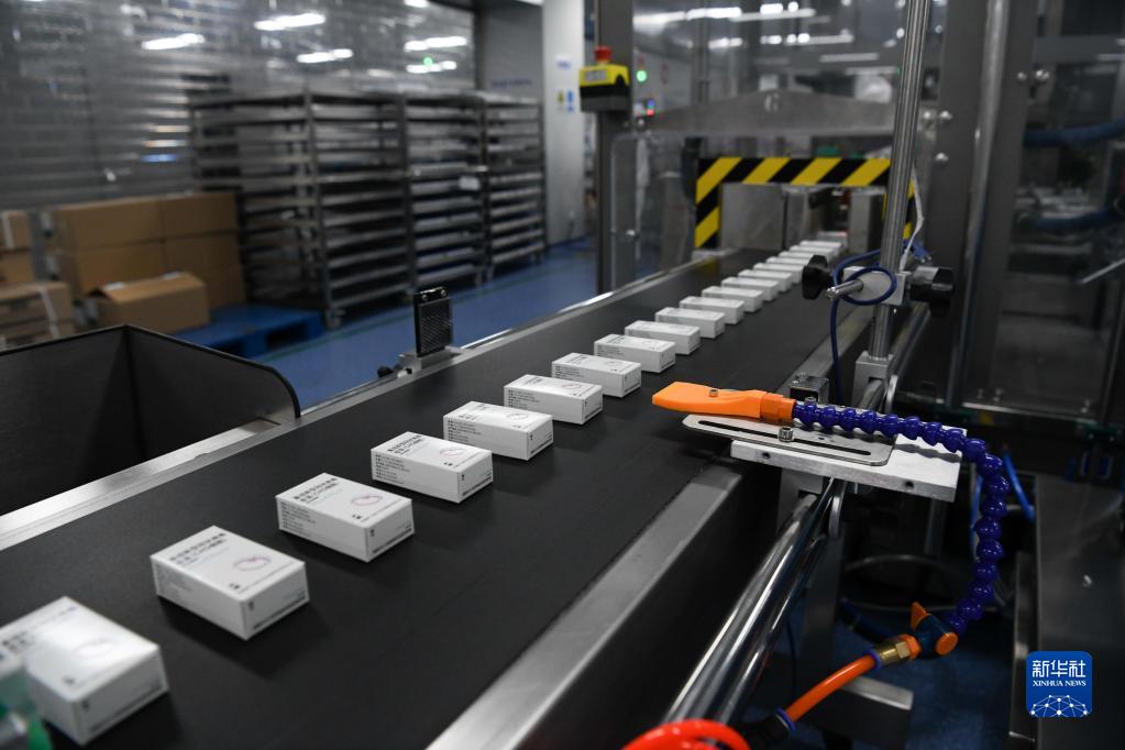 在安徽智飛龍科馬生物制藥有限公司新冠疫苗生產(chǎn)線上,工作人員對(duì)疫苗進(jìn)行包裝(5月20日攝)。新華社記者 黃博涵 攝