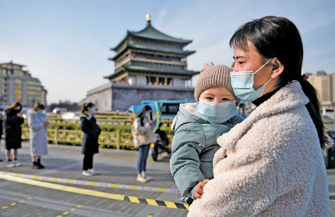 12月17日,在西安市鐘樓附近的核酸檢測點,一位媽媽抱著寶寶排隊等待核酸檢測。新華社記者劉瀟攝