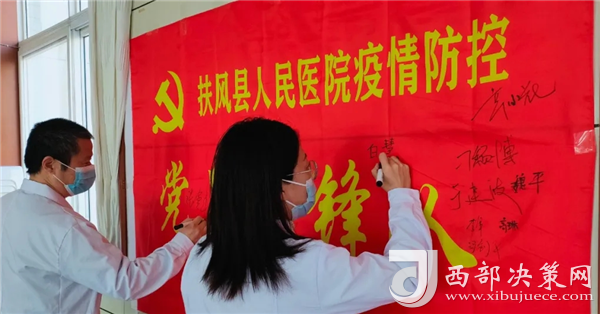 為全力做好汽車站疫情防控工作,院黨總支向全院黨員發(fā)出動員倡議書,職能、臨床內科、臨床外科和醫(yī)技黨支部迅速響應,積極動員。11月23日下午,全體黨員在院多功能廳面對黨旗莊嚴宣誓:“自愿加入疫情防控黨員先鋒隊,堅決以行動譜寫忠誠,用實干詮釋擔當,堅守崗位,盡職盡責,不畏懼、不退縮、不計得失,全力以赴阻擊疫情,守護人民群眾的生命健康”。隨后,院黨總支書記、院長馬忠科,副書記、副院長蘇長岐,支委委員王文輝、趙軒弘、張軍強、陳文博等院領導帶頭在先鋒隊隊旗上簽名許下了“愛的諾言”。