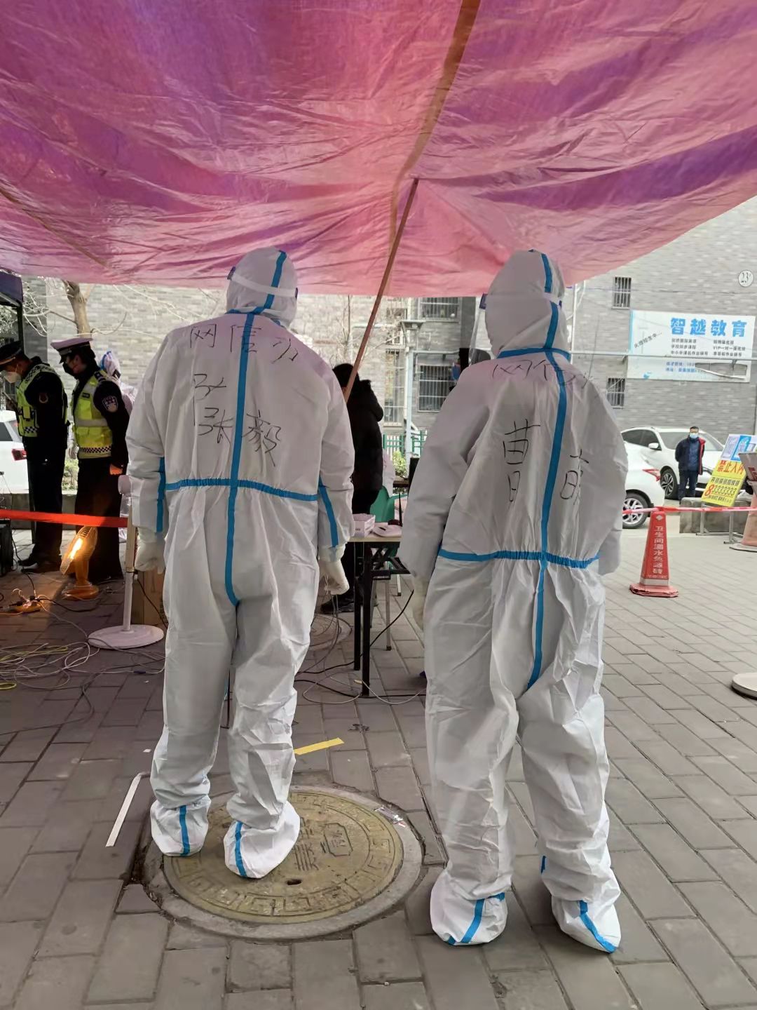 就在隔壁美美佳園小區(qū),張毅、曹萌、胡迪、劉春艷、胡振東、徐晨楊等人也早早鉆進(jìn)了防護(hù)服,從學(xué)習(xí)到上崗、從開始到投入,絲毫沒有停歇,午餐時(shí)間成了唯一交流的機(jī)會,在微信群里工作的照片就像是默契的鏡子:“已看不清是誰的臉,卻能彼此知道你是誰。”