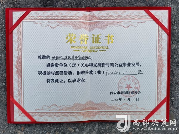 西安市新城區(qū)慈善協(xié)會向陜建基礎集團頒發(fā)支持公益事業(yè)發(fā)展,積極參與慈善活動的榮譽證書。