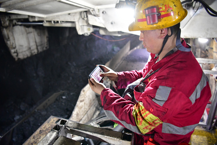 在曹家灘智慧礦山智能化工作面內(nèi),綜采二隊機電副隊長蔡進(jìn)通過操作手機控制生產(chǎn)設(shè)備。新華社記者邵瑞 攝