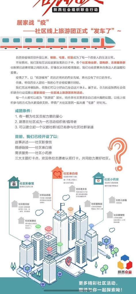 針對目前疫情防控形式,進(jìn)一步調(diào)動激發(fā)社區(qū)內(nèi)生力量動員社區(qū)自組織、志愿服務(wù)隊等團體力量,合力抗疫陜西社會組織聯(lián)合行動倡議志愿者在社區(qū)開展“家門口的志愿服務(wù)”社區(qū)實踐,引導(dǎo)有條件的居民自助互助。