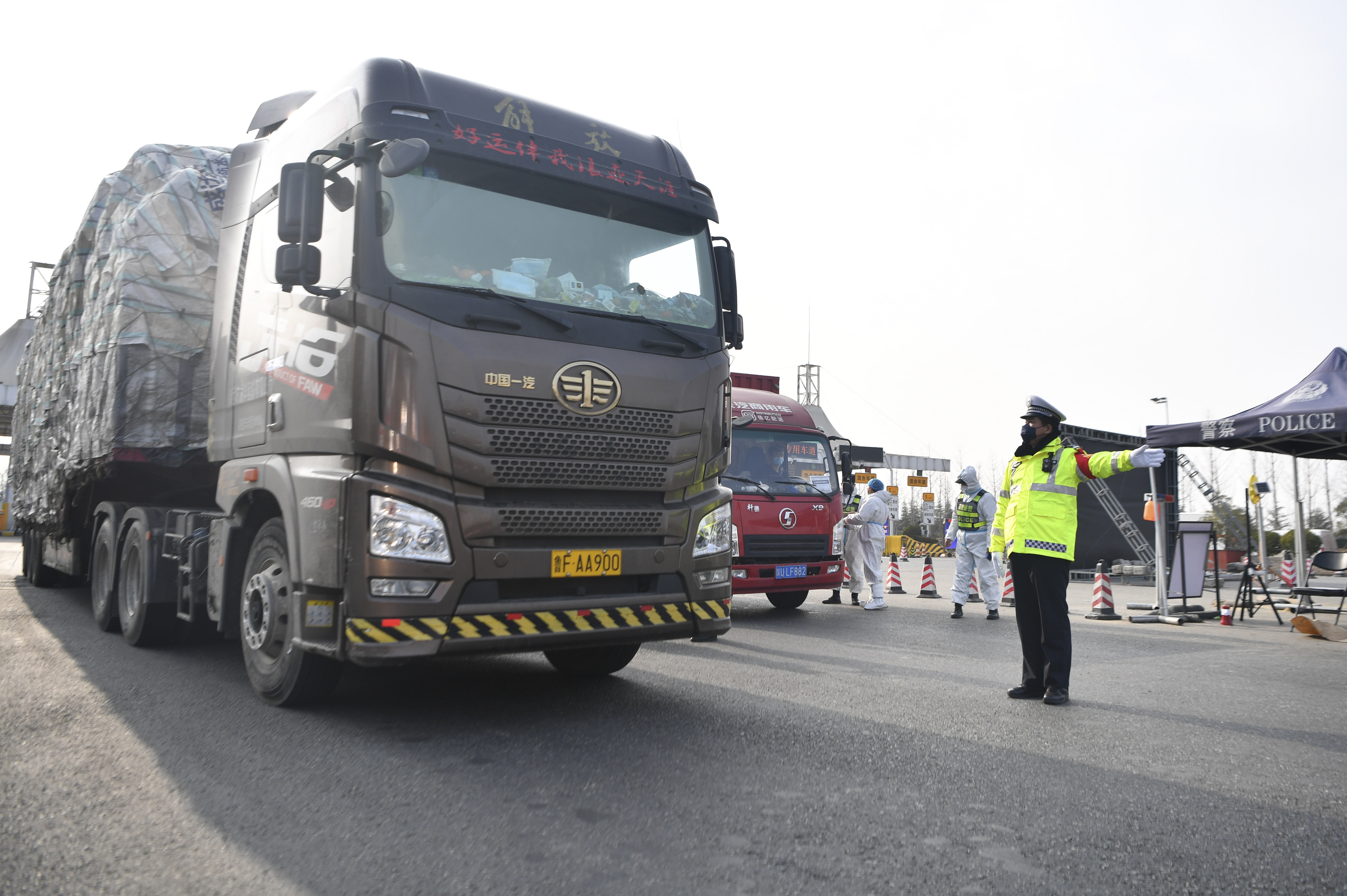 1月10日,西安市公安局交通警察支隊(duì)民警在西安市繞城高速河池寨收費(fèi)站指揮引導(dǎo)車輛通過。新華社記者 張博文 攝