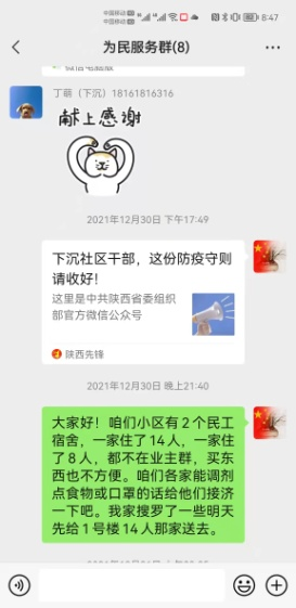 看著手里拎的幾顆白菜、蘿卜、西紅柿,我感到慚愧難當,作為一名黨員、一名下沉干部,實在是失職,沒有履行好“民之所憂,我必念之;民之所盼,我必行之”的使命擔當。投送完愛心菜到家后,我立即在群里倡議小區(qū)下沉干部對1-3-2302的務工人員開展愛心救助活動,并從自家的抗疫儲備物資里勻出了2袋子蔬菜、豆腐乳、魚醬罐頭、口罩、水果等物資,并附上了溫馨小紙條,寫上我的聯(lián)系電話,鼓勵他們堅定克服困難的信心和決心。第二天,社區(qū)領導、小區(qū)鄰居們得知情況后,紛紛伸出援助之手,不到半小時,鍋灶有了、菜刀案板有了、糧食蔬菜也都有了…,社區(qū)的慰問品也送來了。大伙不僅給他們送去了物資,更送去了關心和安慰,他們的生活起居也迅速融入了小區(qū)大家庭,業(yè)主群里每天都有人對他們噓寒問暖,他們也經(jīng)常在業(yè)主群曬他們做的川味美食。他們私下跟我說,這幾年,他們在湖北、新疆等地都遇到過疫情,但最讓他們感動的還是西安,黨和政府的細致安排、西安人民的熱情相助,讓他們在他鄉(xiāng)異地孤立無援時,第一次感到不慌了。