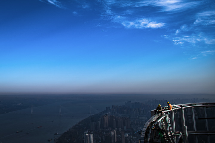 中建三局二公司工人在武漢綠地中心項目建設(shè)現(xiàn)場近500米的高空施工。新華社記者肖藝九 攝