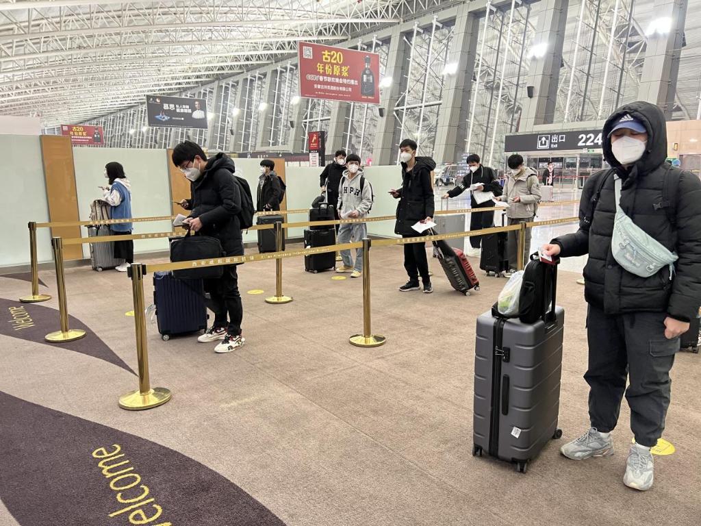 1月20日凌晨5點10分,西安天還未亮,首都航空西安基地的保障人員已經就位,等候學生們的到來。6點39分,第一輛學生大巴到達機場,在工作人員的指引下,大家間隔1米接受核碼查驗,有序進入候機樓辦理值機手續(xù)。8點34分,162名學生已全部辦理完值機,托運行李148件,陸續(xù)通過安全檢查候機。9點31分,學生開始登機,并依次使用手部消毒,認真落實各項防疫政策,9點43分,162名學生已全部登機完畢。