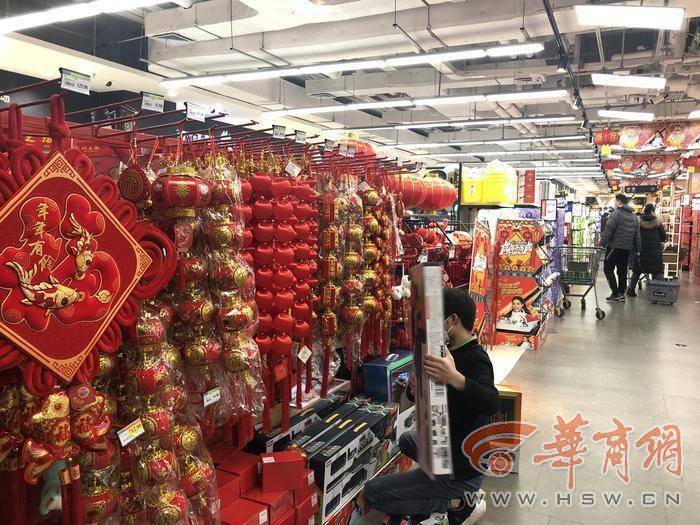 記者體驗(yàn)了一下,超市嚴(yán)格落實(shí)防疫要求,顧客掃碼,憑綠碼進(jìn)入。超市門口,有燈籠、“福”字等年貨。超市播著過年喜慶的音樂,貨物齊全,市民們?cè)谟行蛸徫?,工作人員正在給部分貨物加貨。