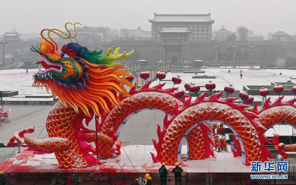 1月23日,施工人員在西安市南門廣場組裝龍鳳吉祥燈飾。