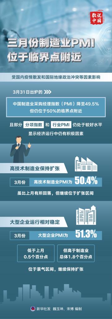 受國內(nèi)疫情散發(fā)和國際地緣政治沖突等因素影響,31日出爐的中國制造業(yè)采購經(jīng)理指數(shù)(PMI)降至49.5%,但仍位于50%的臨界點附近,且部分分項指數(shù)和行業(yè)PMI仍處于較好水平,顯示經(jīng)濟運行中仍有積極因素。