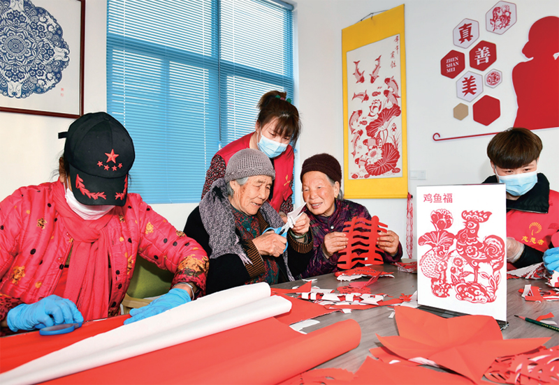 山東省日照市嵐山區(qū)按照就近、普惠原則建設(shè)養(yǎng)老服務(wù)中心,并組建志愿服務(wù)隊(duì)為老人提供助餐、助潔、助醫(yī)等愛心服務(wù)。圖為2022年2月27日,志愿者在日照市嵐山區(qū)虎山鎮(zhèn)黃家峪村養(yǎng)老服務(wù)中心陪老人剪紙、聊天。 新華社記者 郭緒雷/攝