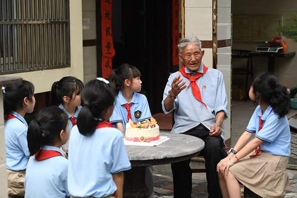 2020年6月28日,浙江省湖州市吳興區(qū)八里店鎮(zhèn)組織小學(xué)生開(kāi)展“童心向黨”主題繪畫、聆聽(tīng)老黨員講故事、參觀紅色教育基地等活動(dòng)。圖為吳興區(qū)第一小學(xué)學(xué)生聆聽(tīng)八里店鎮(zhèn)前村村老黨員陳金茂(右二)講故事。新華社記者 黃宗治/攝