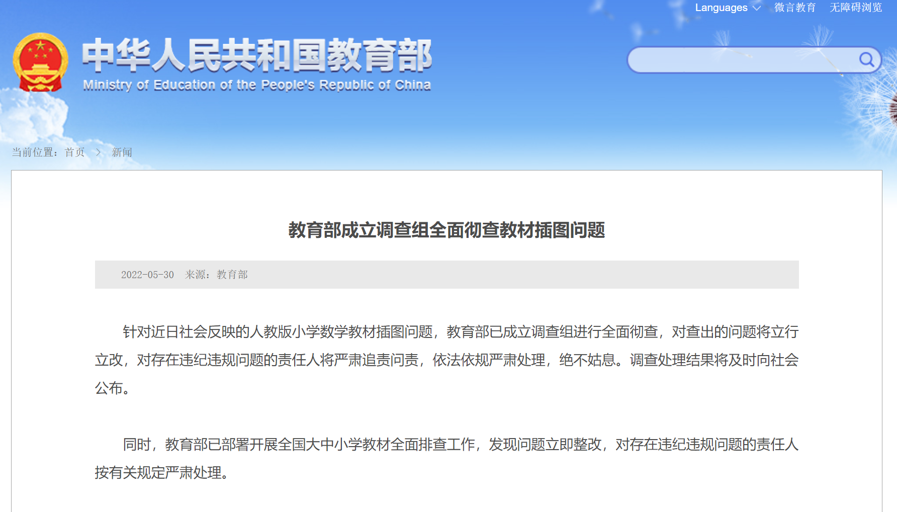 針對近日社會反映的人教版小學數(shù)學教材插圖問題,教育部已成立調查組進行全面徹查,對查出的問題將立行立改,對存在違紀違規(guī)問題的責任人將嚴肅追責問責,依法依規(guī)嚴肅處理,絕不姑息。調查處理結果將及時向社會公布。