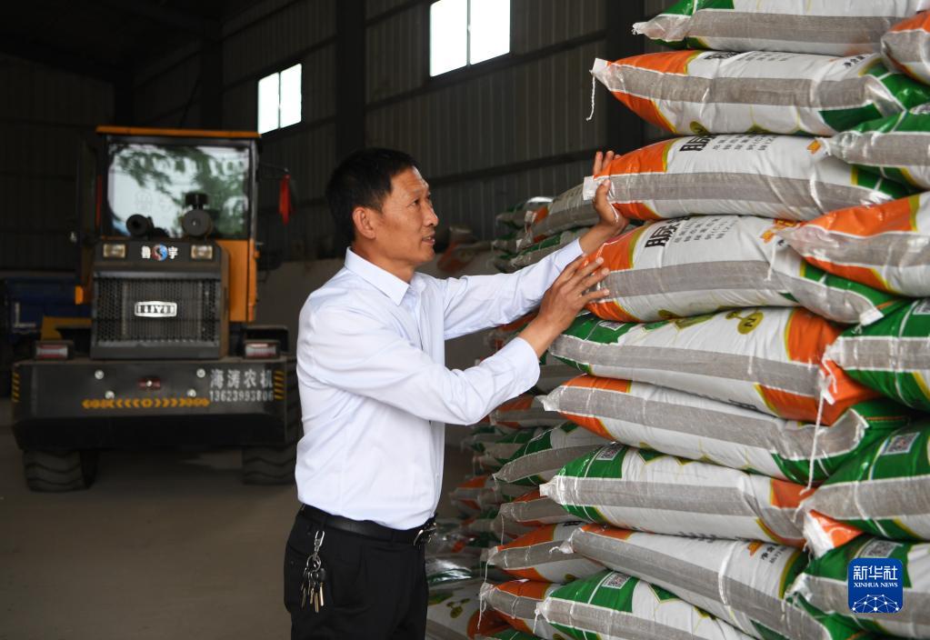 5月26日,在河南省南陽(yáng)市唐河縣湖陽(yáng)鎮(zhèn)張灣村,種糧大戶(hù)趙建成在整理倉(cāng)庫(kù)里的化肥,準(zhǔn)備夏收之后的夏種。新華社記者 張浩然 攝