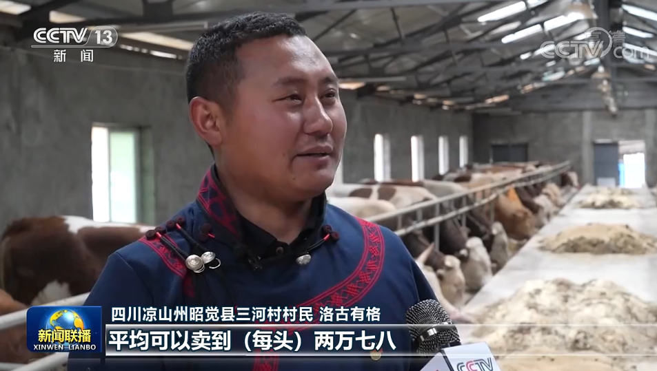 四川涼山州昭覺縣三河村村民 洛古有格:當(dāng)時(shí)總書記來的時(shí)候,我們這個(gè)養(yǎng)牛只有十幾頭。通過發(fā)展,我們?nèi)哟逵辛?000多頭這個(gè)西門塔爾?!,F(xiàn)在我們這個(gè)牛,平均可以賣到(每頭)兩萬七八,大的可以賣到三萬多元,效益特別好。
