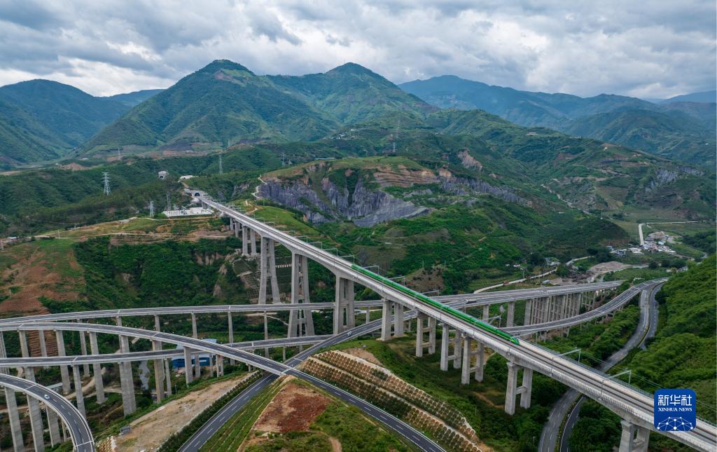 復(fù)興號(hào)列車通過中老鐵路南溪河特大橋(無人機(jī)照片,6月2日攝)。新華社記者 江文耀 攝