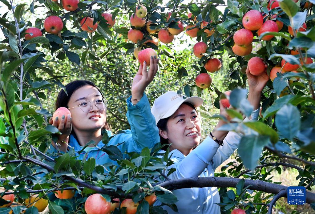 2021年9月10日,游人在陜西省榆林市米脂縣高西溝村蘋果采摘園采摘蘋果。 新華社記者 陶明 攝