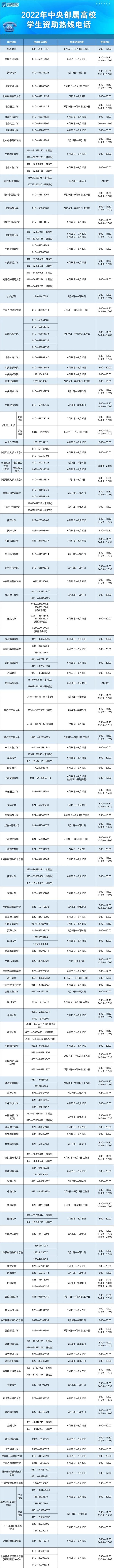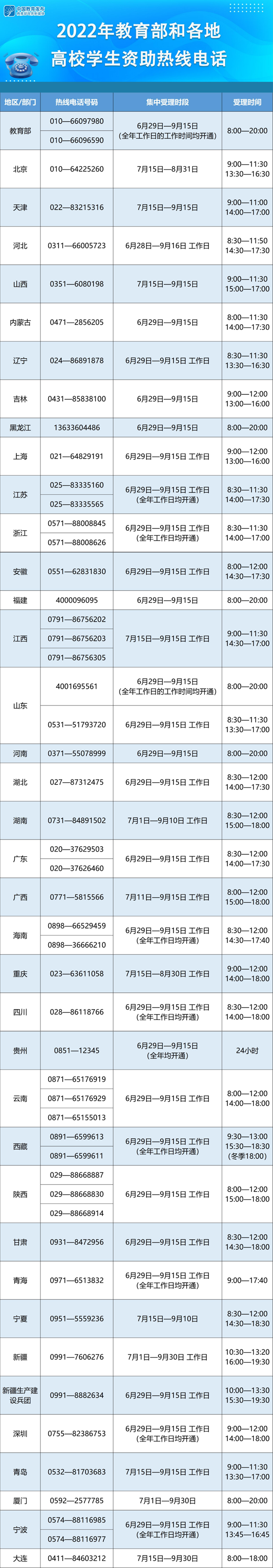 教育部要求各省(區(qū)、市)及所屬高校、中央高校學(xué)生資助管理部門均開通熱線電話,并結(jié)合實際情況自行確定集中受理時段和具體受理時間。