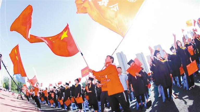 長安大學(xué)畢業(yè)典禮上,同學(xué)們高舉五星紅旗。長安大學(xué)供圖