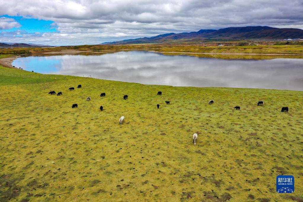 牛群和馬在黃河瑪曲段干流沿岸的一處草地上吃草(9月17日攝,無人機(jī)照片)?,斍h在2019年就實(shí)現(xiàn)了草畜平衡。新華社記者 郎兵兵 攝
