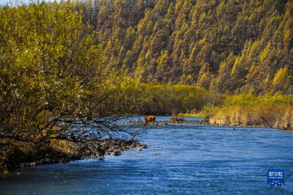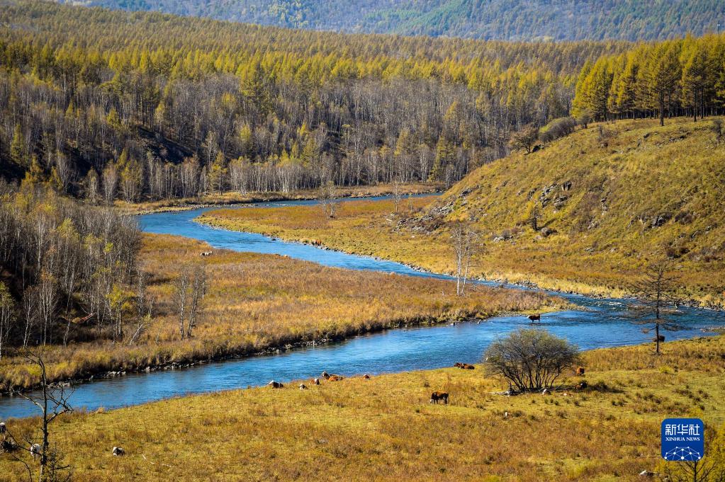 9月21日,牛群在阿爾山國家森林公園內(nèi)的河岸邊覓食。新華社記者 彭源 攝