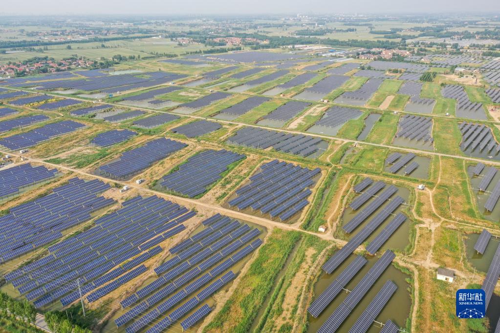 山東高青縣湖東村周邊建設(shè)的千余畝漁光互補養(yǎng)殖場(2022年5月24日攝,無人機照片)。新華社記者 朱崢 攝