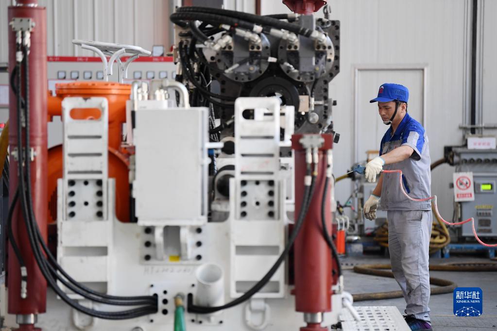 在位于秦創(chuàng)原總窗口所在地陜西省西咸新區(qū)的陜西太合智能鉆探有限公司,工人準(zhǔn)備對智能定向鉆機進行性能調(diào)試(2022年6月17日攝)。新華社記者 李一博 攝