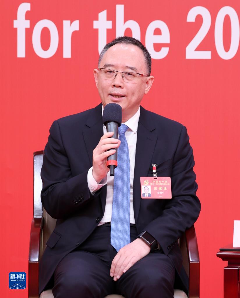 10月18日,中國共產(chǎn)黨第二十次全國代表大會新聞中心舉行集體采訪,請北京、天津、河北、山西、內(nèi)蒙古、遼寧、吉林代表團(tuán)新聞發(fā)言人出席,介紹代表團(tuán)學(xué)習(xí)討論二十大報(bào)告情況,并回答記者提問。這是天津市委副書記金湘軍在回答記者提問。新華社記者 張玉薇 攝