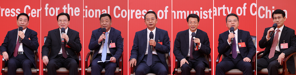 10月19日,中國共產(chǎn)黨第二十次全國代表大會新聞中心舉行集體采訪。山東、河南、湖北、湖南、廣東、廣西、海南代表團(tuán)新聞發(fā)言人出席,介紹代表團(tuán)學(xué)習(xí)討論二十大報告情況,并回答記者提問(拼版照片)。新華社記者 張玉薇 攝