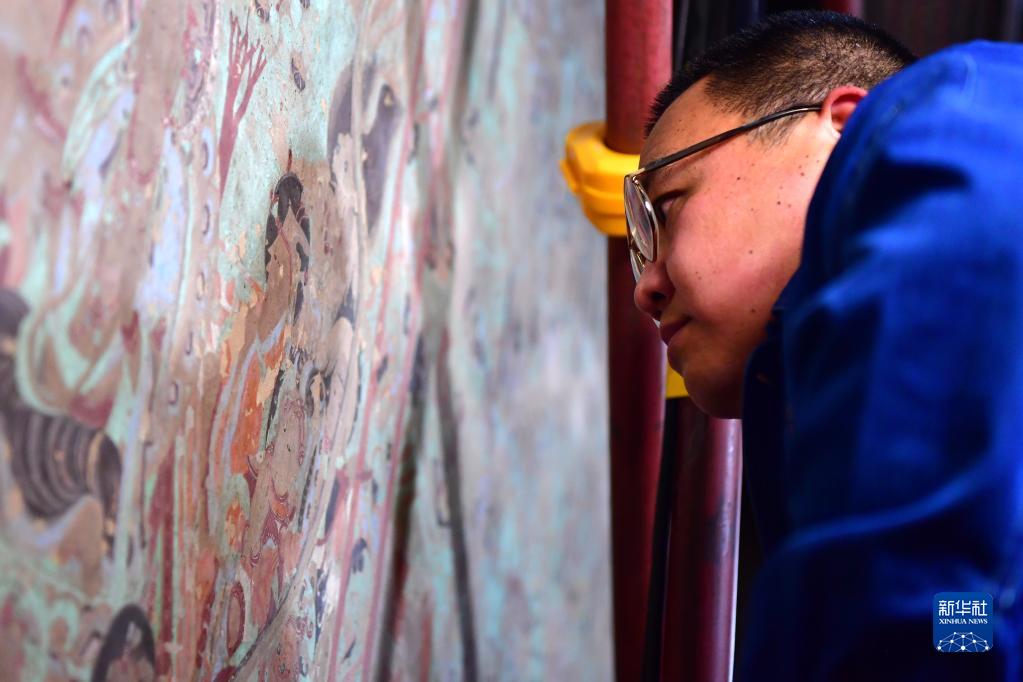 在莫高窟第231窟,敦煌研究院文物保護技術服務中心的壁畫修復工作者在修復出現病害的壁畫(2022年4月19日攝)。新華社記者 杜哲宇 攝