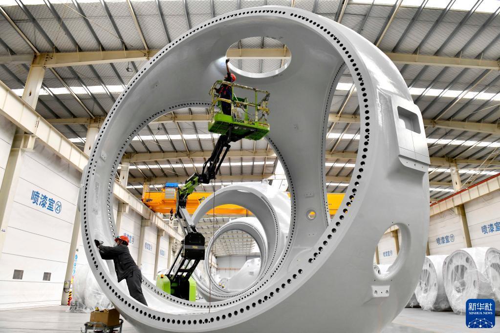 在山東省惠民縣風(fēng)電裝備產(chǎn)業(yè)基地涂裝車(chē)間,工作人員對(duì)風(fēng)電輪轂進(jìn)行涂裝(2022年6月7日攝)。新華社記者 郭緒雷 攝