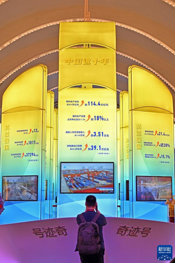 觀眾在“奮進(jìn)新時(shí)代”主題成就展中央綜合展區(qū)內(nèi)拍攝中國(guó)經(jīng)濟(jì)“奇跡號(hào)”巨輪模型(2022年10月8日攝)。新華社記者 李鑫 攝