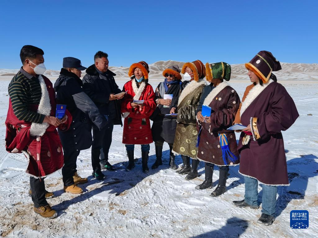 2021年12月20日,瑪多縣人民法院院長錢快乾(左一)給當(dāng)?shù)啬羺^(qū)群眾宣講法律知識。新華社發(fā)