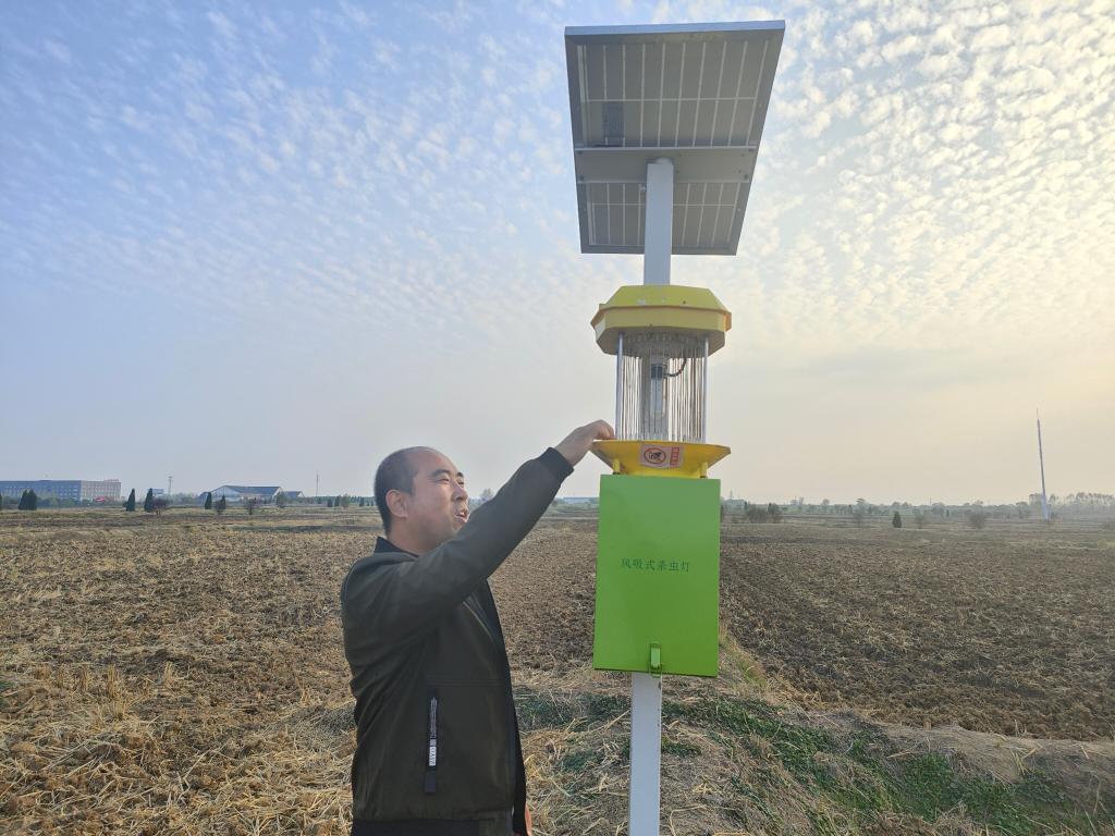 閆大明正在介紹風(fēng)吸式殺蟲燈。新華社記者 姜?jiǎng)?攝