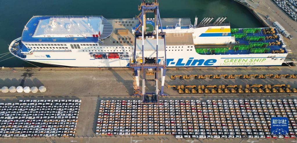 12月7日,出口商品車在山東港口煙臺(tái)港集結(jié)裝船(無(wú)人機(jī)照片)。新華社發(fā)(唐克 攝)