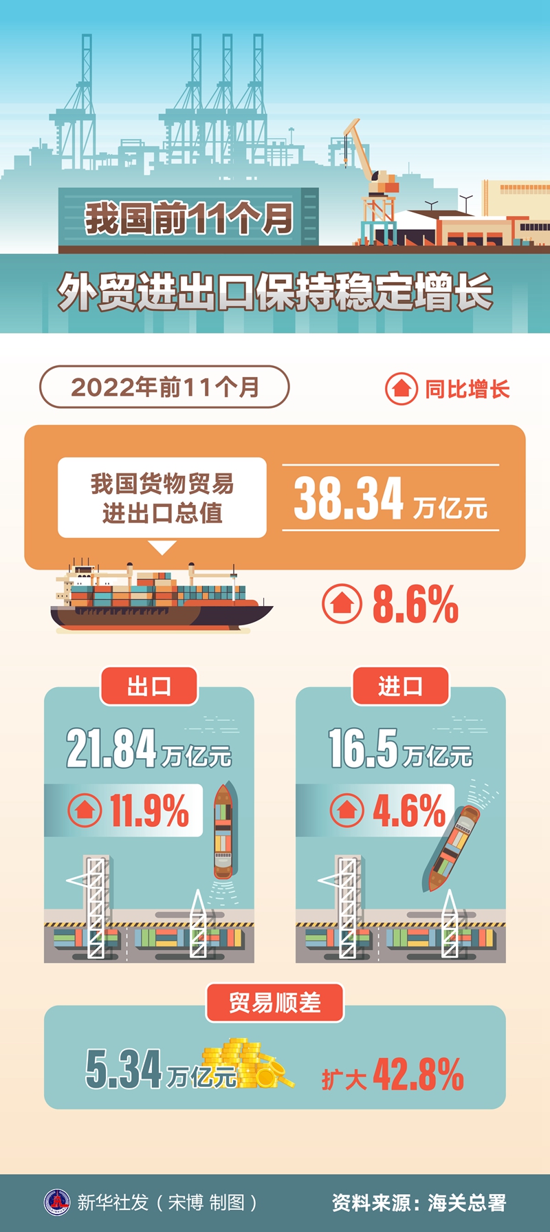 海關(guān)總署7日發(fā)布數(shù)據(jù):今年前11個(gè)月,我國(guó)貨物貿(mào)易進(jìn)出口總值38.34萬(wàn)億元,同比增長(zhǎng)8.6%。其中,出口21.84萬(wàn)億元,增長(zhǎng)11.9%;進(jìn)口16.5萬(wàn)億元,增長(zhǎng)4.6%;貿(mào)易順差5.34萬(wàn)億元,擴(kuò)大42.8%。