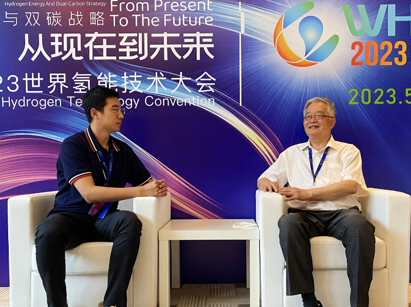 圖為國際氫能協(xié)會副主席毛宗強(右)接受新華網采訪